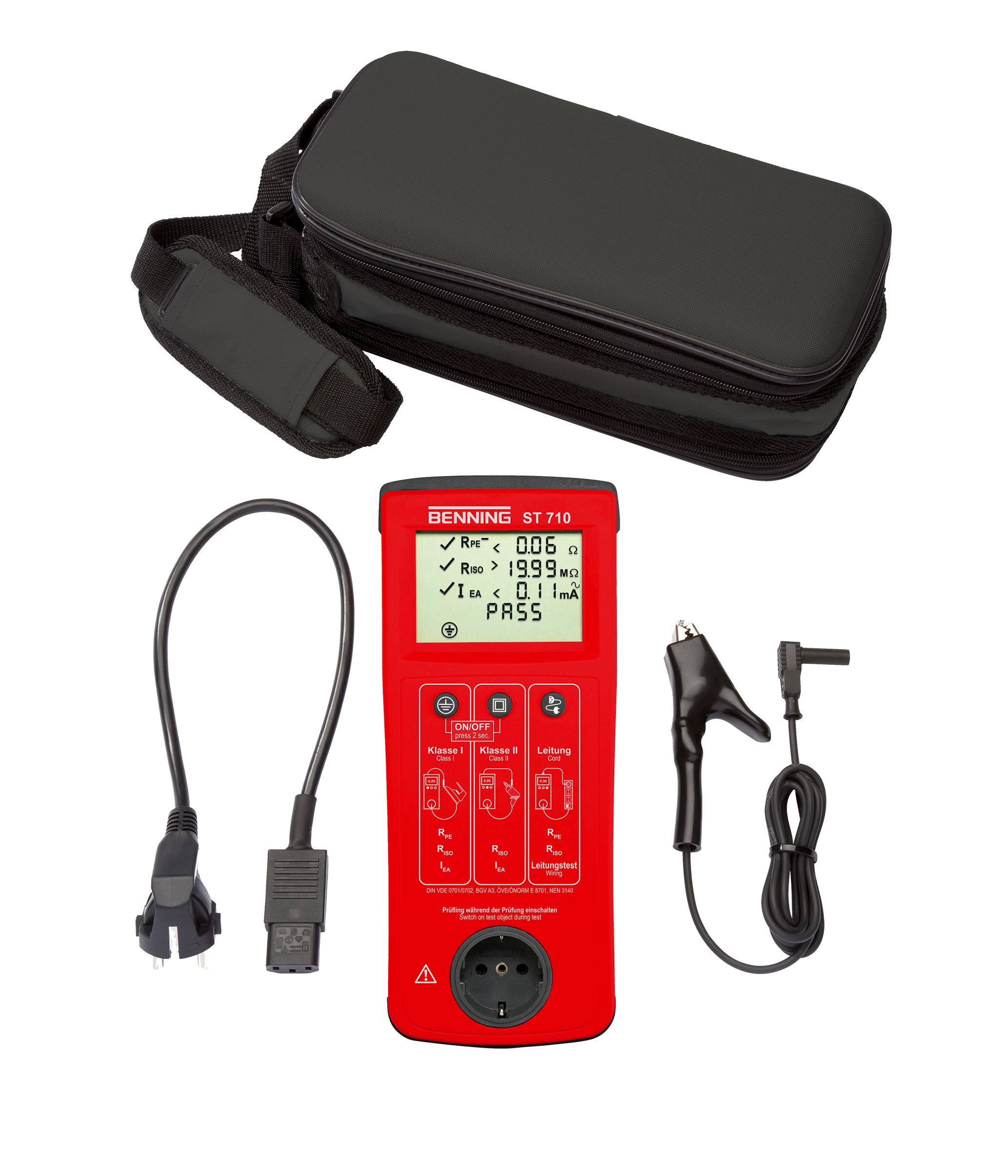 • Inclusief draagtas, testsnoer met krokodillenklem, apparatensnoer, batterijen en gebruiksaanwijzing
